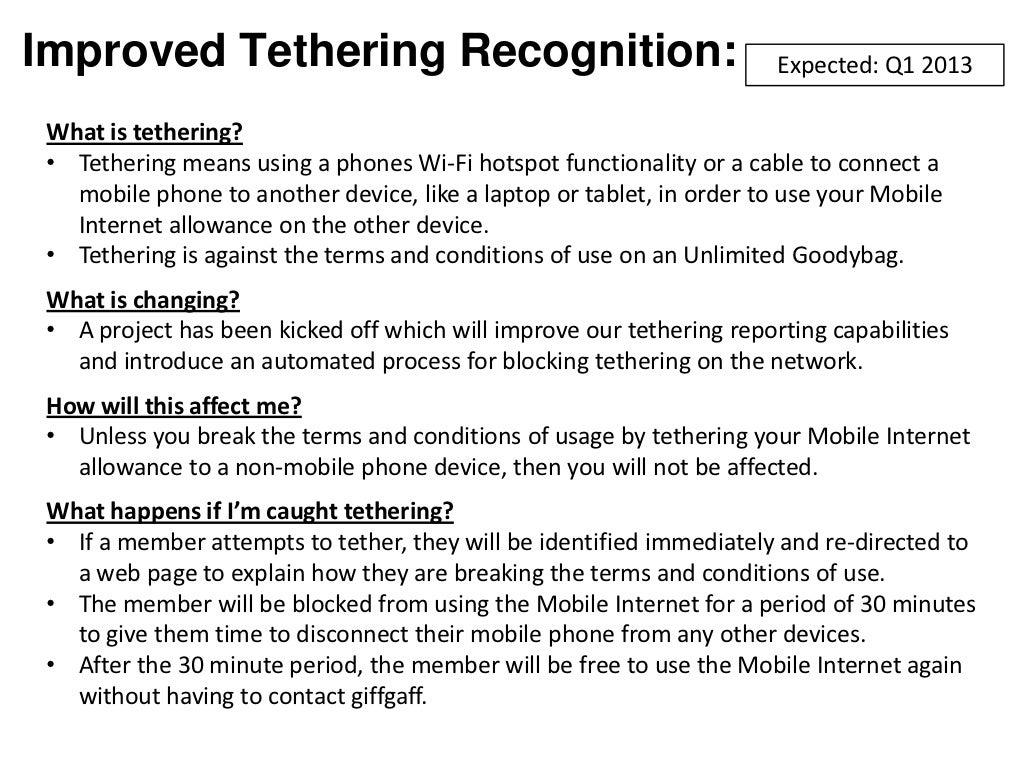 I read Giffgaff are going to implement sophisticated anti-tethering techniques on plans that don't allow it. it was in the slide deck that they put out when they talked about the price rises, they did say which quarter they planned to introduce it, but I can't remember when it was, sometime in the next 6 months I think.