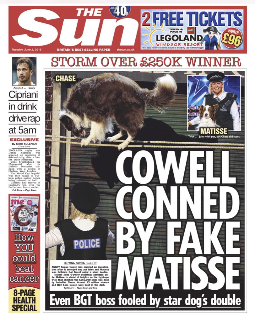 The gutter rag called The Sun loves a story like BGT winner's dog act. The Sun needs to clean up its own newspaper before pointing its grubby finger at other people. And what about The Sun's 'phone hacking con tricks! They were simply, simply dreadful and caused complete misery to people who had done nothing wrong whatsoever. Would not give that tacky rag houseroom. Jules showed us Chase in the semi finals. |