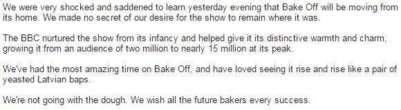 I am disappointed that it's leaving the BBC where it sat very well but sadly it's a done deal.Have any of the presenters said they won't be moving with the show? They'll be doing the same job but no doubt for a much larger pay packet. Of course there will be advertisements but they'll be shown in between each round, they won't interfere with the baking bits. It may be a disaster, who knows what tomorrow brings but I'm certainly willing to give it a try. |