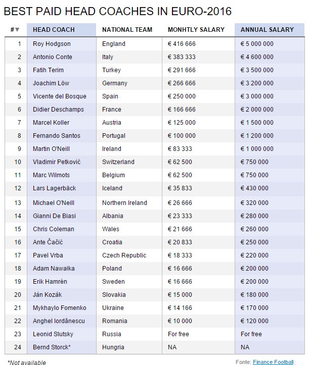) from Euro 2016. Please feel to add more. Oldest Player Gábor Király (GK, Hungary) – 40 years and 2 months Outfield Player: Ricardo Carvalho (DF, Portugal) - 38 years 0 months Youngest Player Marcus Rashford (FW, England)- 18 years 7 months Tallest Player Costel Pantimillion (Romania, GK)- 6ft 8 inches Shortest Player Lorenzo Insigne (Italy, FW) - 5ft 4 inches Oldest teams by average age 1) 29.39 years– Republic of Ireland (11 players 30 or over) 2) 28.83 years– Russia (9 players 30 or over) 3) 28.70 years – Czech Republic (11 players 30 or over) Youngest teams by average age 25.39 years – England (3 players 21 or under) 25.43 years– Germany (3 players 21 or under) 25.57 years– Switzerland (4 players 21 or under Tallest Teams by average height 1.86m – Sweden 1.85m – Austria, Belgium, Croatia, Germany, Hungary, Iceland 1.84m – Czech Republic, Poland, Slovakia, Switzerland, Ukraine Heaviest average teams by KG 80.30kg – Germany 80.17kg – Sweden 79.70kg – Switzerland Most valuable squads in £ millions (according to Transfermarkt) Germany: 421.5 Spain: 418.1 Belgium: 345.7 France: 340.5 England: 334.5 Portugal: 241.3 Croatia: 204.2 Italy: 204.0 Turkey: 139.5 Poland: 131.5 Switzerland: 129.4 Wales: 126.5 Russia: 100.1 Ukraine: 96.5 Austria: 96.3 Slovakia: 68.3 Rep of Ireland: 67.0 Sweden: 65.1 Czech Rep: 48.3 Romania: 42.0 Iceland: 31.2 Albania: 30.7 Northern Ireland: 26.9 Hungary: 20.5 Highest paid national Managers (annual salary in Euros) https://pbs.twimg.com/media/CeOf4KLUIAA7RsZ.jpg Most expensive players by transfer fee 1) Gareth Bale (Wales) - £86 million 2) Cristiano Ronaldo (Portugal)- £80 million) 3) Zlatan Ibrahimovic (Sweden)- 59 million * note: I think Ronaldo was more expensive if you take into account inflation however, not sure though Most Represented League Premier League: 103 players Bundesliga: 57 players Serie A: 52 players *Note: Interestingly the English Championship has 31 players, way more than the 22 from French Ligue 1 Most Represented Clubs 1= Liverpool & Juventus (12 players each) 3- Tottenham (11 players) 4- Manchester United (10 players) 5- Bayern Munich, Barcelona, Fenerbahce (9 players) |
