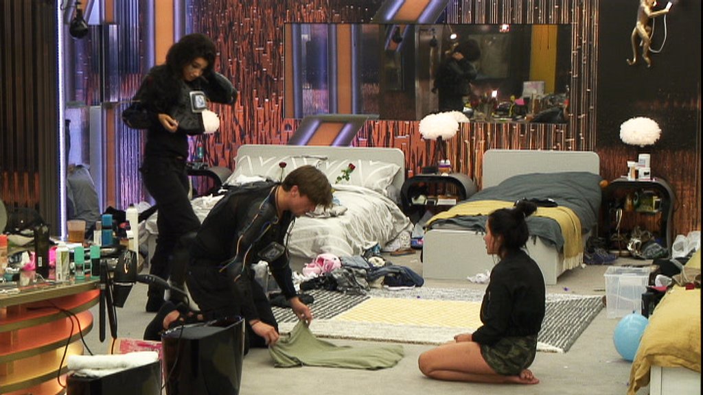 5.19pm: @lewis_bloor @MarnieGShore and @chloekhanxxx are trying to fold a shirt. Definitely a 3-man job. 👕 #CBBLive