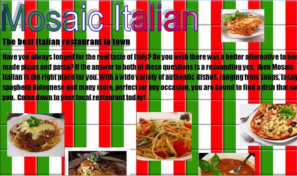 [LIST][*]Have you ever felt that the Italian options at your local pub are limited? [*]Does it seem like the only dish available is salty potatoes?[*] [*]Do you not think you are getting a true taste of Italy?[/LIST]Well fear no more as the company that brought you award winning Breakfast Cereal Jurassic Treats is proud to present its own line of Gourmet Italian Restaurants. Mosaic Italian offers a wide range of authentic Italian dishes and drinks. From Lasagna Al Forno to Pollo con funghi and several other popular dishes virtually guaranteed to satisfy your Italian needs. All of our ingredients are fresh and from organic sources, but the price is no more than your local Maccy D’s. However I can confirm that the nutritional value is, much, much higher.